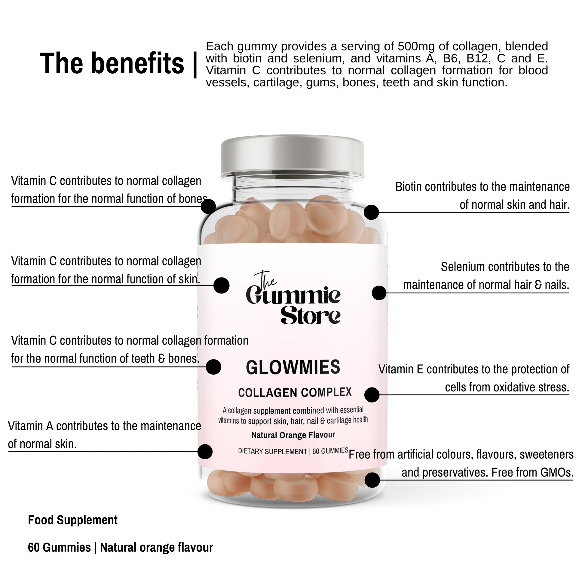 Glow from within with a delicious daily collagen boost. Each gummy delivers 500mg of high-quality collagen, expertly blended with Biotin, Selenium, and vitamins A, C and E to support healthy skin, hair, nails and cartilage.