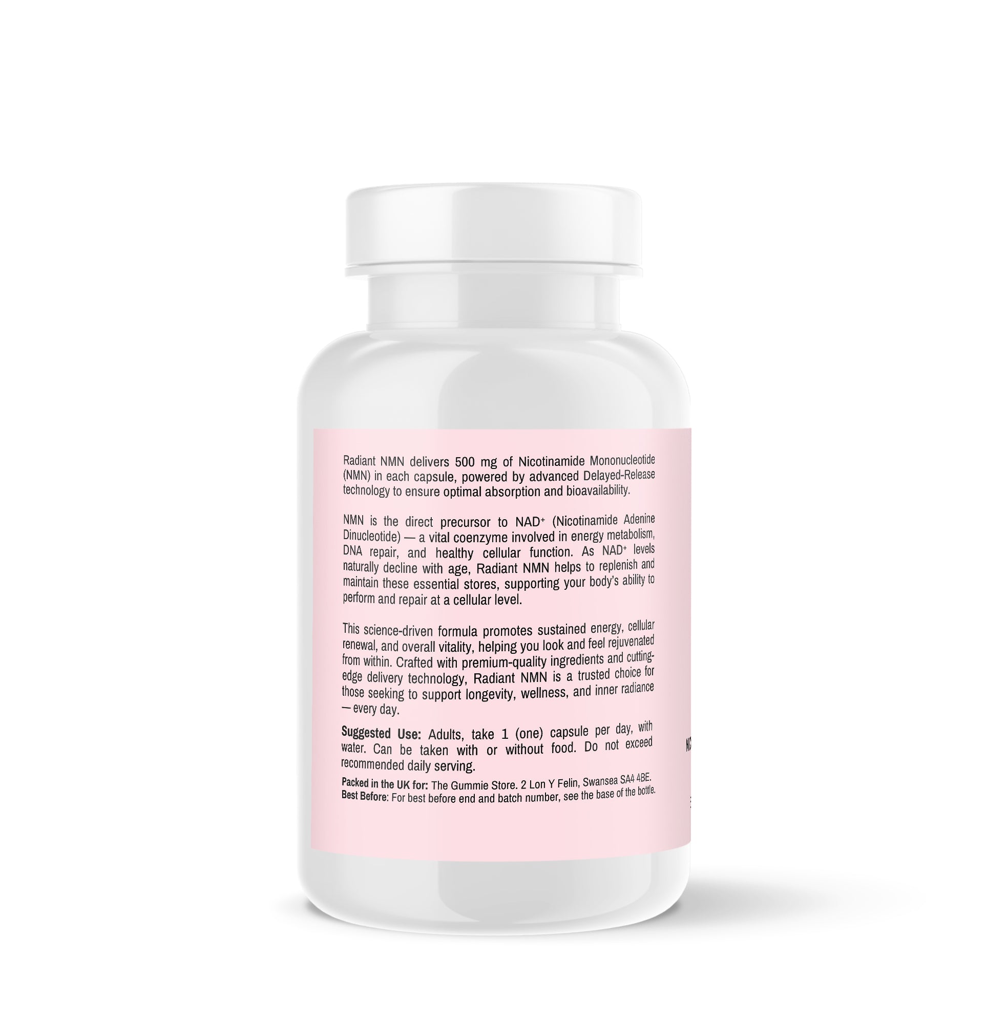 A high-purity NMN supplement designed for daily nutritional support. Presented in delayed-release capsules to allow gradual release of the active ingredient for enhanced absorption efficiency.