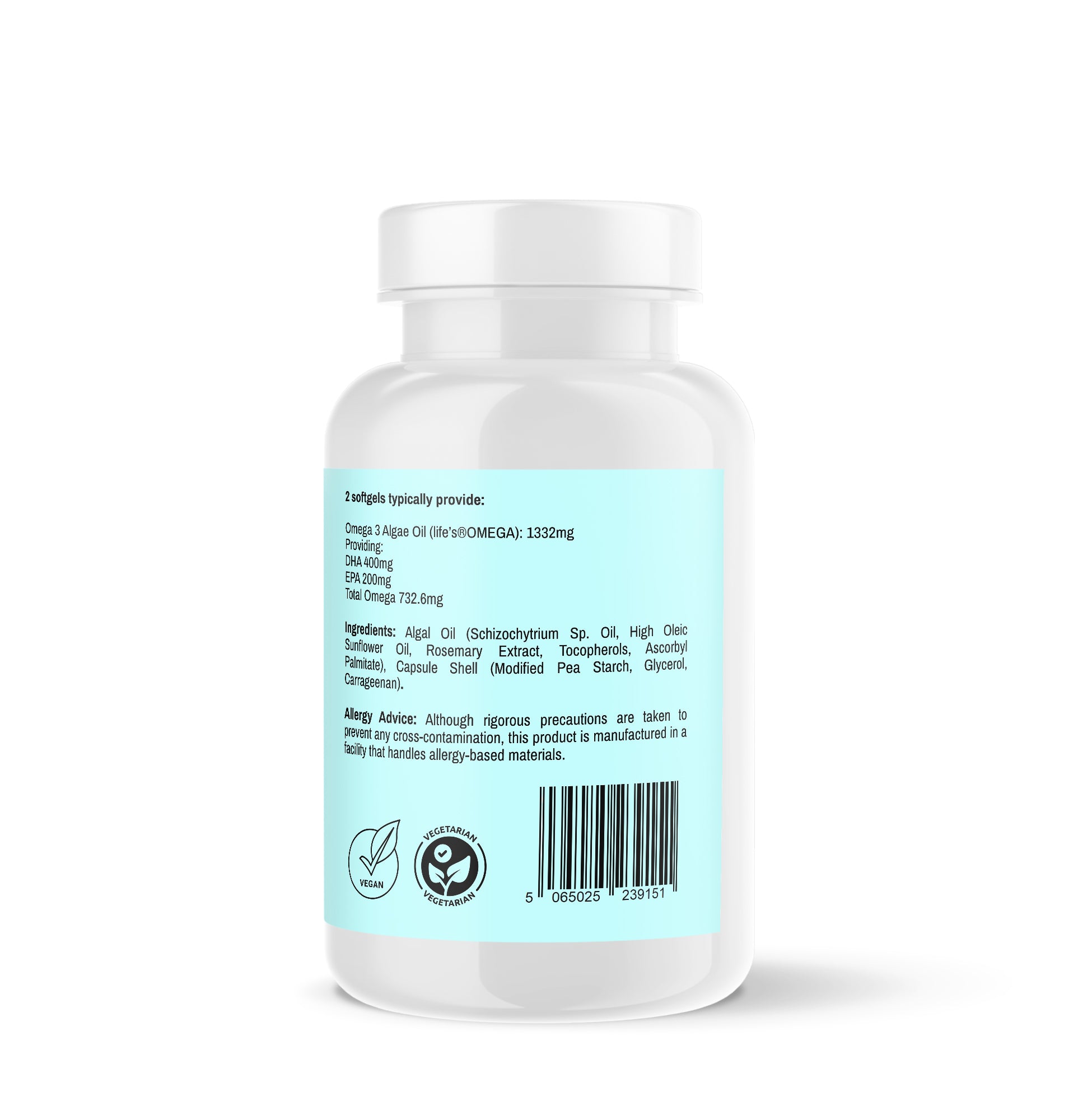 A premium vegan food supplement providing Omega-3 fatty acids sourced directly from algae. Designed as a plant-based alternative to traditional fish oils, offering a sustainable option for those looking to support their daily nutritional intake. Providing 400mg DHA and 200 EPA per serving of 2 capsules.